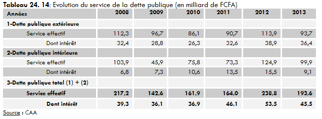 Accueil » Statistics » Evolution of public debt service (in billions of CFA francs) between 2008 and 2013