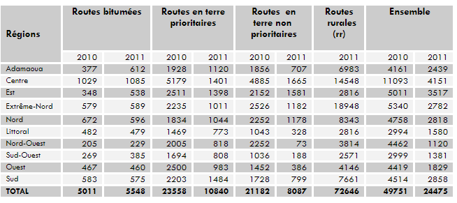 The roads being asphalted (Ayos-Bonis, Obala-Nkolessong, etc.) are not included in the linear of asphalt roads
