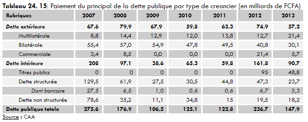 Payment of the principal of the public debt by type of creditor (in billions of CFA francs) between 2007 and 2013